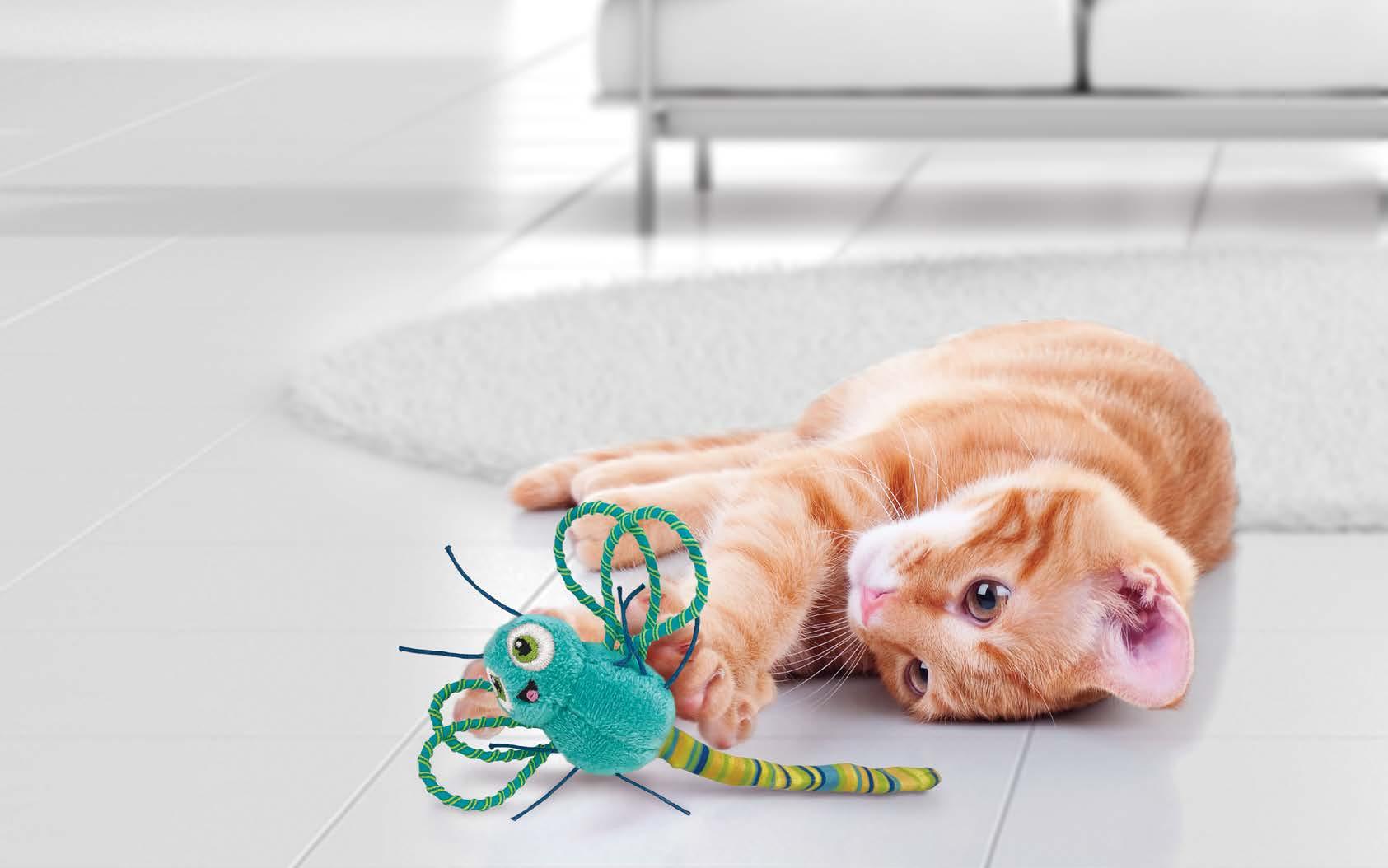 • Belletjes in de handschoenen en de kreukelende, ratelende zak stimuleren natuurlijke instincten