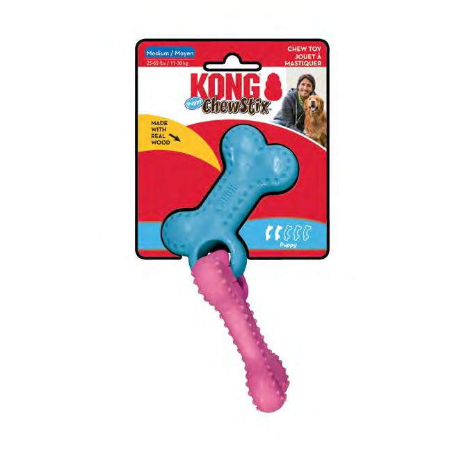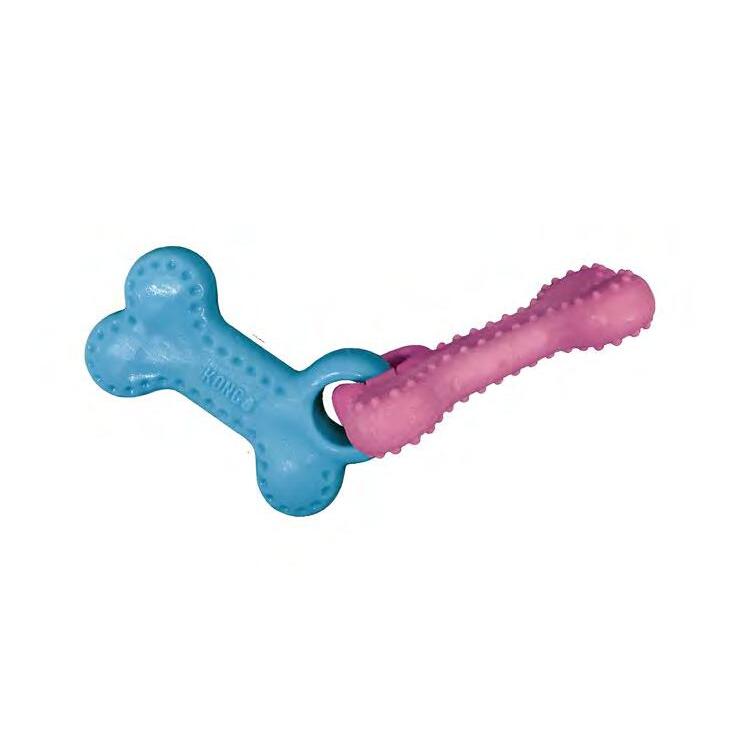 KONG ChewStix Puppy rewards teething puppies’ chewing needs with a durable solution. Much safer than everyday sticks. Made with TPR and real wood with an enticing coconut scent. These durable ChewStix will last through long, blissful chewing sessions, satisfying chewing instincts and reinforcing appropriate chewing behavior. Safely rounded edges and texture extend enjoyment and help clean teeth. CURVED BONES - Fill paste groove with KONG Stuff’N to extend play. LINKED BONES - Linked design invites shaking, satisfying thrashing instincts. Freeze first to help soothe sore gums.
