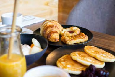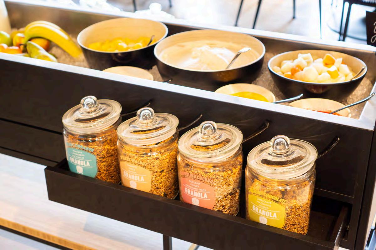 Various types of oven-fresh bread. Pastries, savory and sweet spreads, dips, and fresh vegetables. Yogurt, granola, muesli, superfoods, fruit sauce, and seasonal fruit. Front-cooking with hot dishes like eggs and pancakes. Coffee, tea, fruit juice, and flavored water.