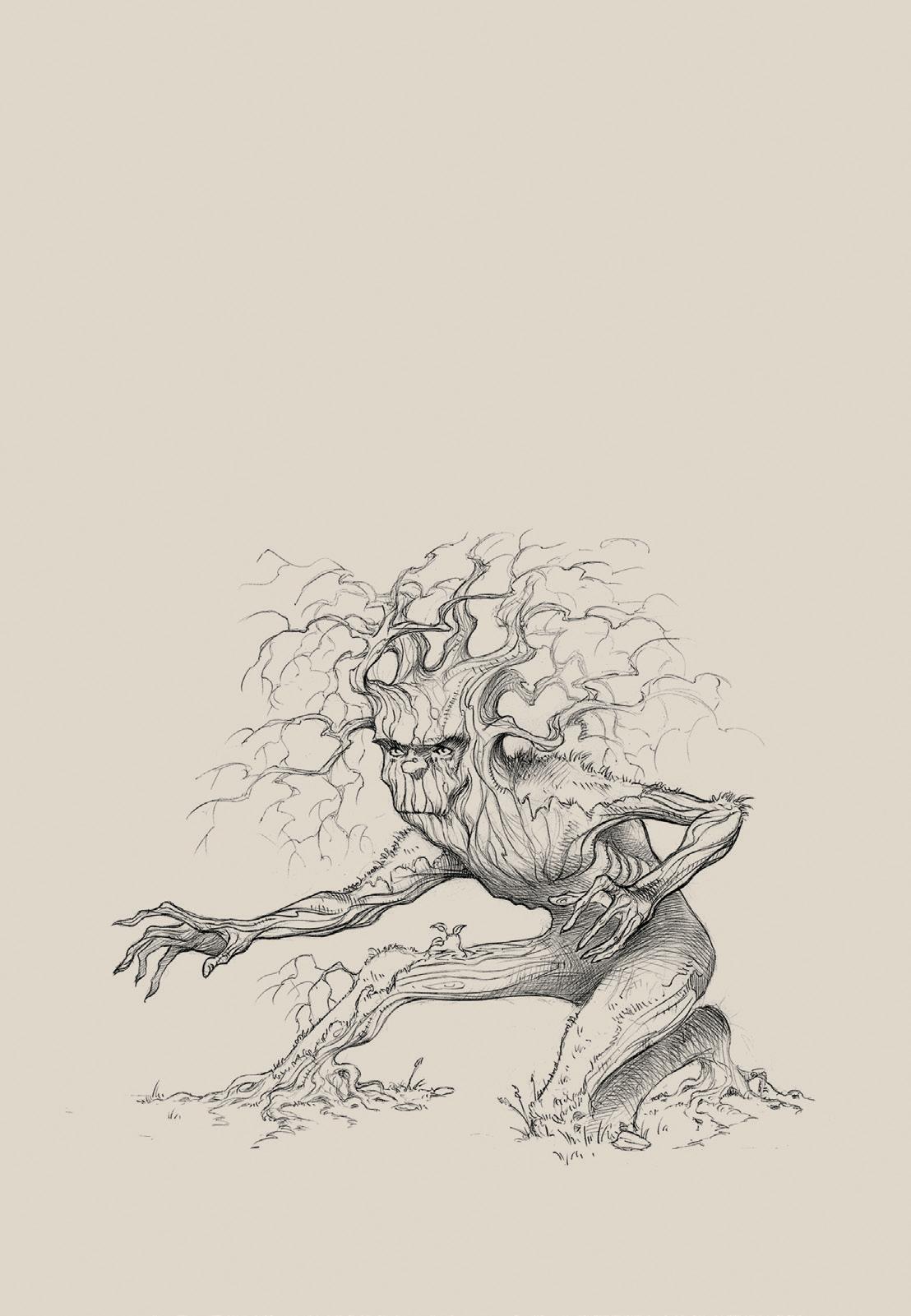 For å vise hvor stor skapningen din er kan du tegne en gjenstand alle vet størrelsen til ved siden av, for eksempel et tre eller et hus. Se på disse skissene. Det første vesenet kan ha en hvilken som helst størrelse, mens det andre er en ruvende kjempe.