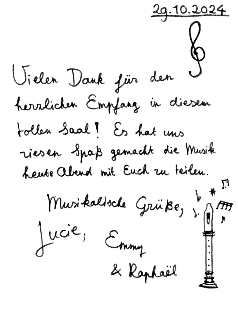 Ein voll gefüllter Saal für eine Blockflöte – dieses Kunststück schaffte die niederländische Musikerin bei ihrem »fulminanten Debüt« (so die »Ruhr Nachrichten«). Bei so viel Publikum hat Lucie Horsch für ihr Konzert am 22. Januar 2026 mit dem B’Rock Orchestra gleich Verstärkung mitgebracht. Im Gästebuch hat sie gezeigt, dass sie die Flöte nicht nur spielen, sondern auch zeichnen kann: