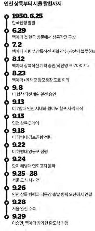 을 휘어잡았다.“당일 상황이 여의치 않다면 내가 작전을 현지에서 중단시키겠소이다. 그 러면 잃게 되는 것은 내 평판밖에 없을 것입 니다. 하지만 인천은 성공할 것이고, 이 작전 은 10만 명의 목숨을 구할 것이외다.”맥아더 발언은 이렇게 끝났다. 발언이 끝나고도 잠시 침묵이 이어졌다. 맥아더의 역전승. 이 원맨쇼 이후 인천 이외 상륙지를 언급하는 목소리는 거의 들리지 않았다.