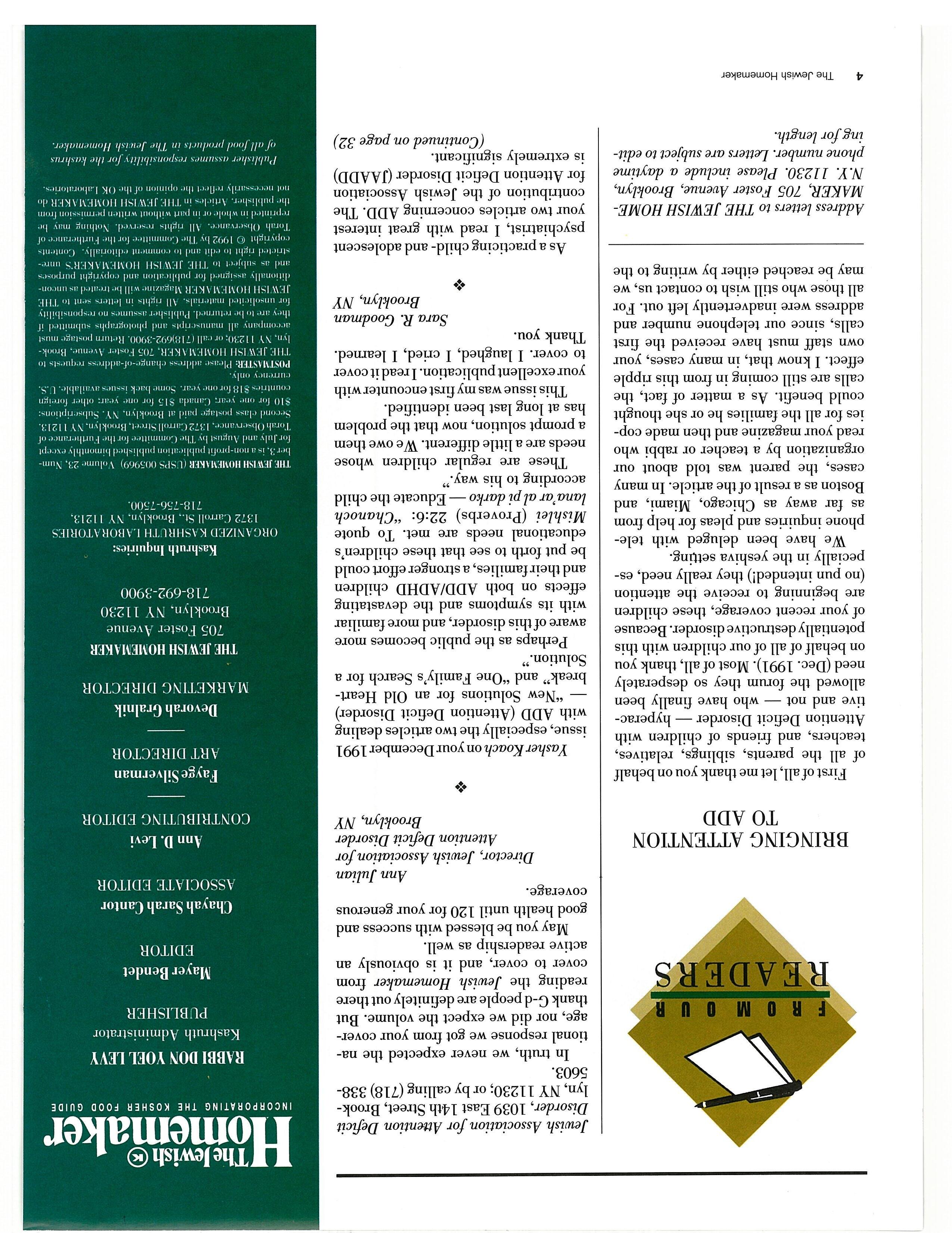 First ofall, let me thank you on behalf of all the parents, siblings, relatives, teachers, and friends of children with Attention Deficit Disorder hyperac tive and not who have finally been allowed the forum they so desperately need (Dec. 1991). Most ofall, thank you on behalf of all of our children with this potentiallydestructive disorder. Because of your recent coverage, these children are beginning to receive the attention (no pun intended!) they really need, es pecially in the yeshiva setting.