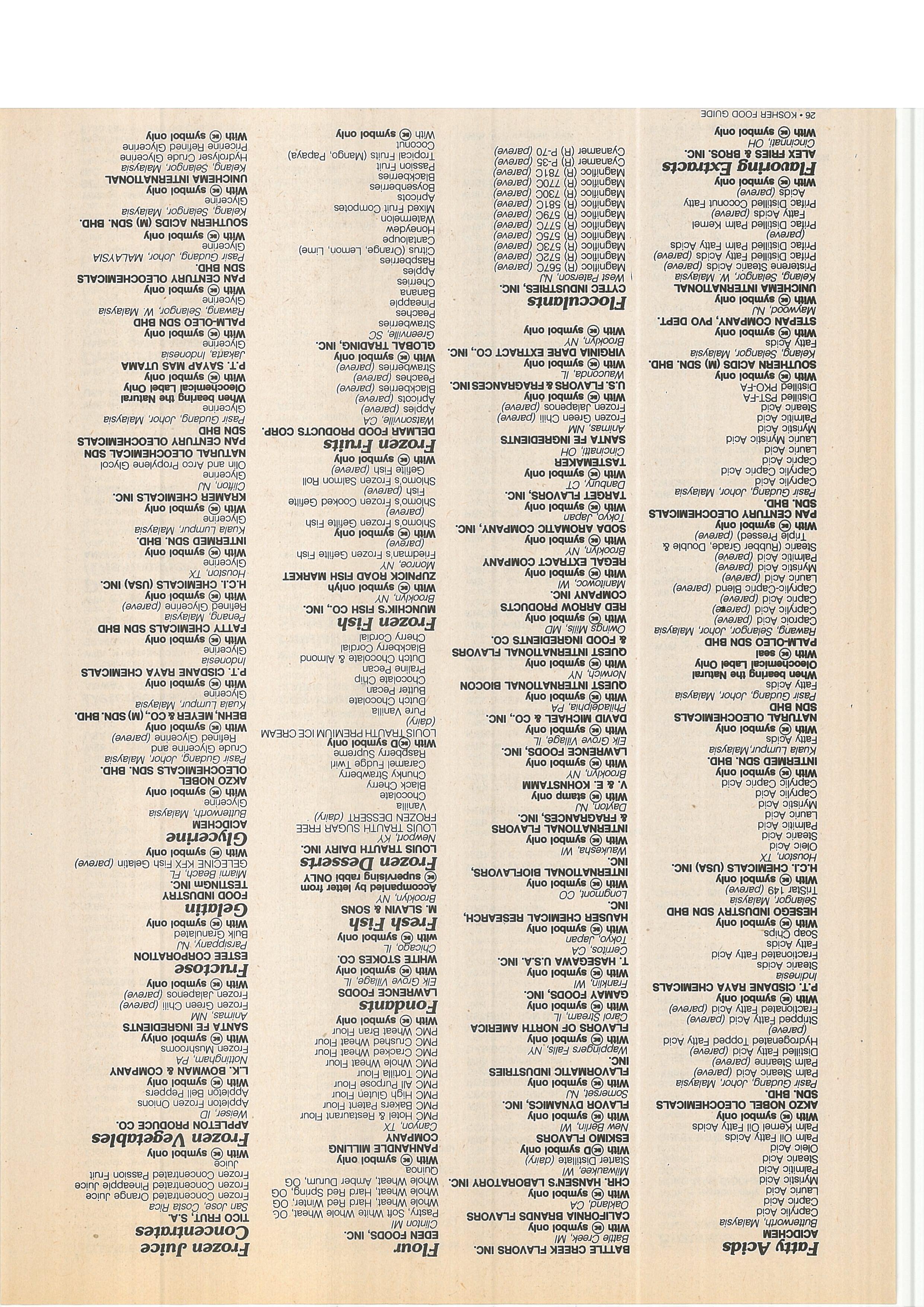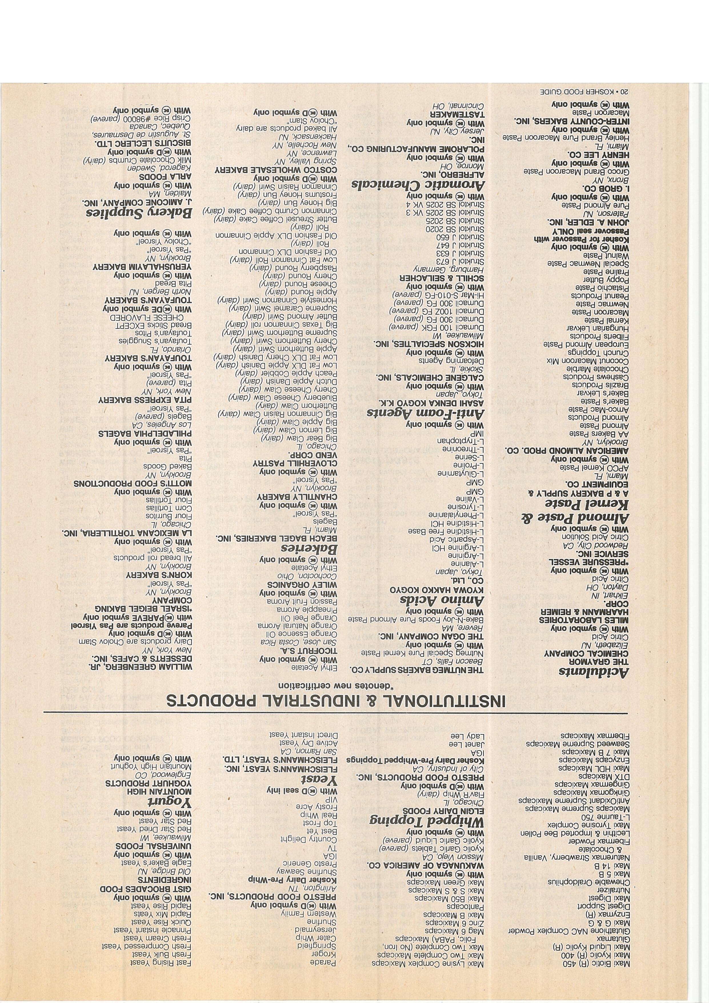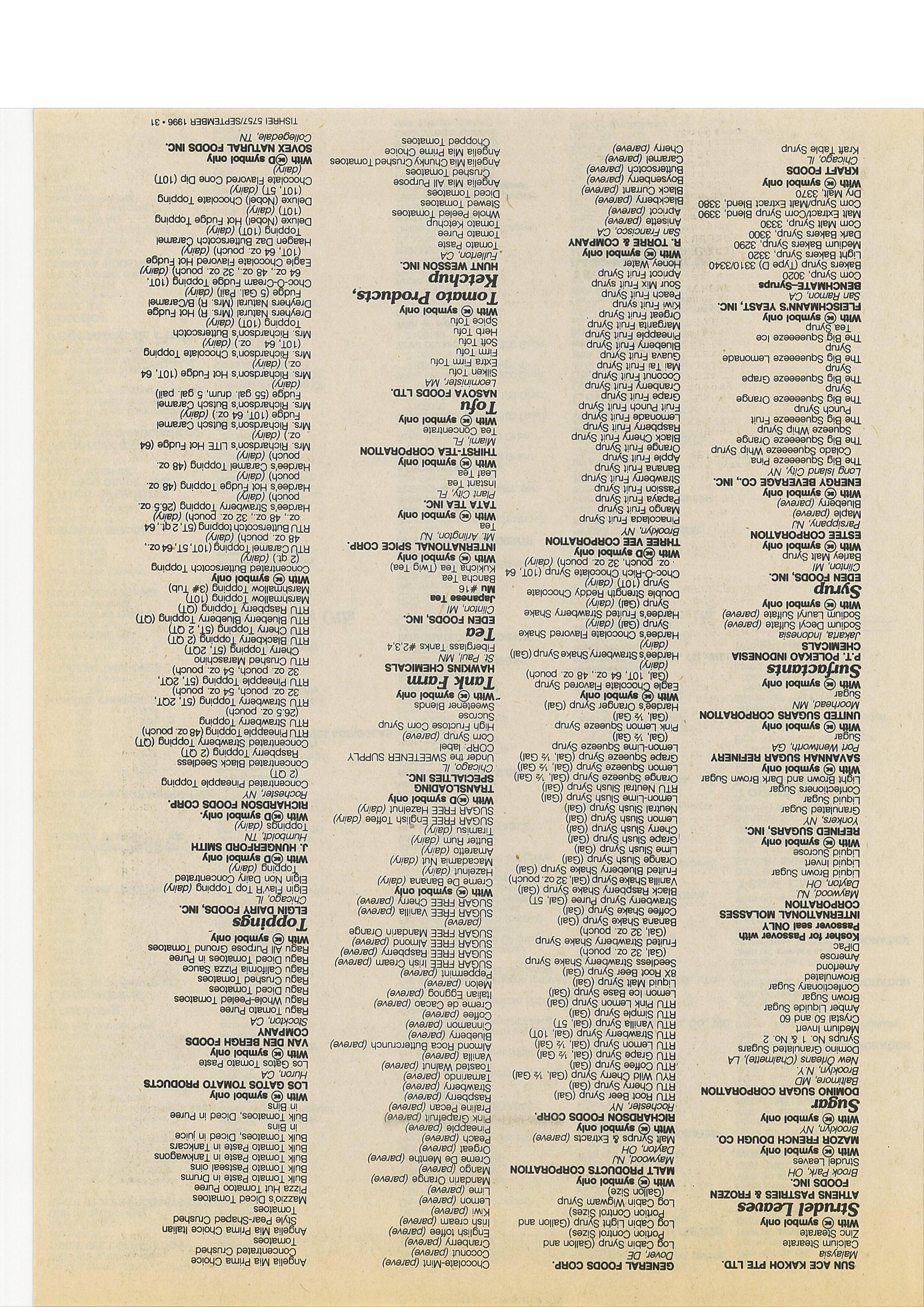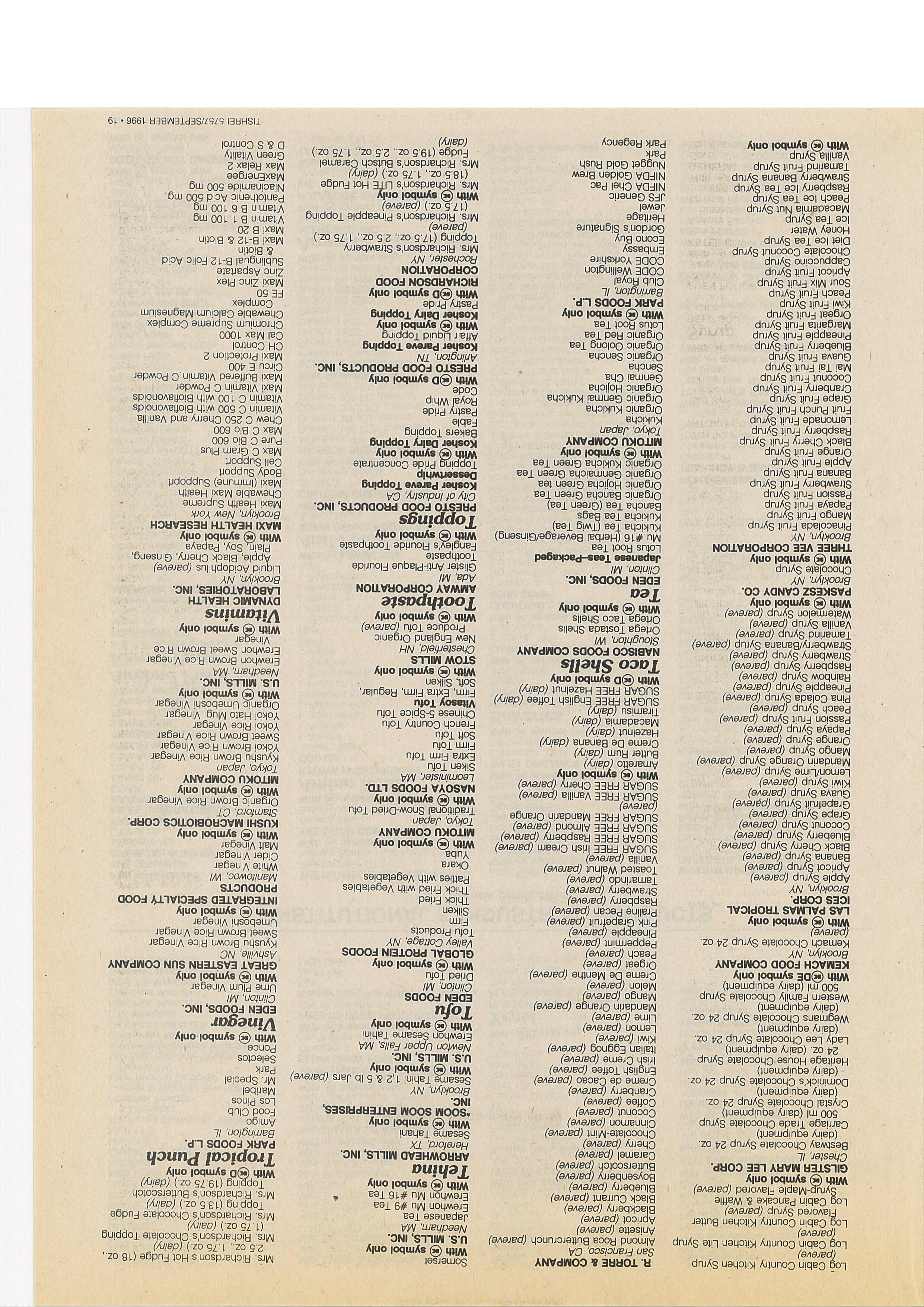 Acid (Vitamin C) Inactive Yeast Products nies Red ~eét Powder (oare~) With l~) symbol o’ñly With € symbOl only AMERIC~AN TRANSFER CO. Tomato Powder did Worfd Bakers Margarine (pareve) *TANABE SEIYAKU CO., LTD. UNIVERSAL FOODS CORPORATION Fresno, CA Tomato JOicé Powder Old World Clear Liquid Shortening Oaka, Japan Juneau, WI Tanker 2601 Grapefn~it Powder (pares) Biötin Autöliied Yeast Extracts Tanker 2602 Guava ~&wder’ Oid Wdrld Corn Oil (pa,’eve) Eólic Acid With € ~ymbol only Tanker 2604 Lemop l?owder Old World Cottonseed Oil l’pareve)’ With € symbol only UNIVERSAL FOODS CORPORATION Tanker 2605 Mango Powder Old Wö’rld G~lic (pareve) VITAMINS, INC. Milwaukee, WI Tanker 2606 Strawberry Powder Old World Rorser&dish (pareve) Chica ~, IL Red Star Dri&l Yeast Tanker p607 Tangerine Powder Old World Onions (parev~) With ~) symbol only Red Star Y~st Tanker 2608 lilruit Mix Powder Old World ~an-O-GâId (pa,eve) WEINSTEIN NUTR~ONAL € symbol only BILL ADKINS TRUCKING Golden FruifMix Powder Old World Reanut Oil (parevef PRODUCTS Yeast ct Chino, CA Ao* Powder Old w6Hd Sh~Illöts (P~~)
