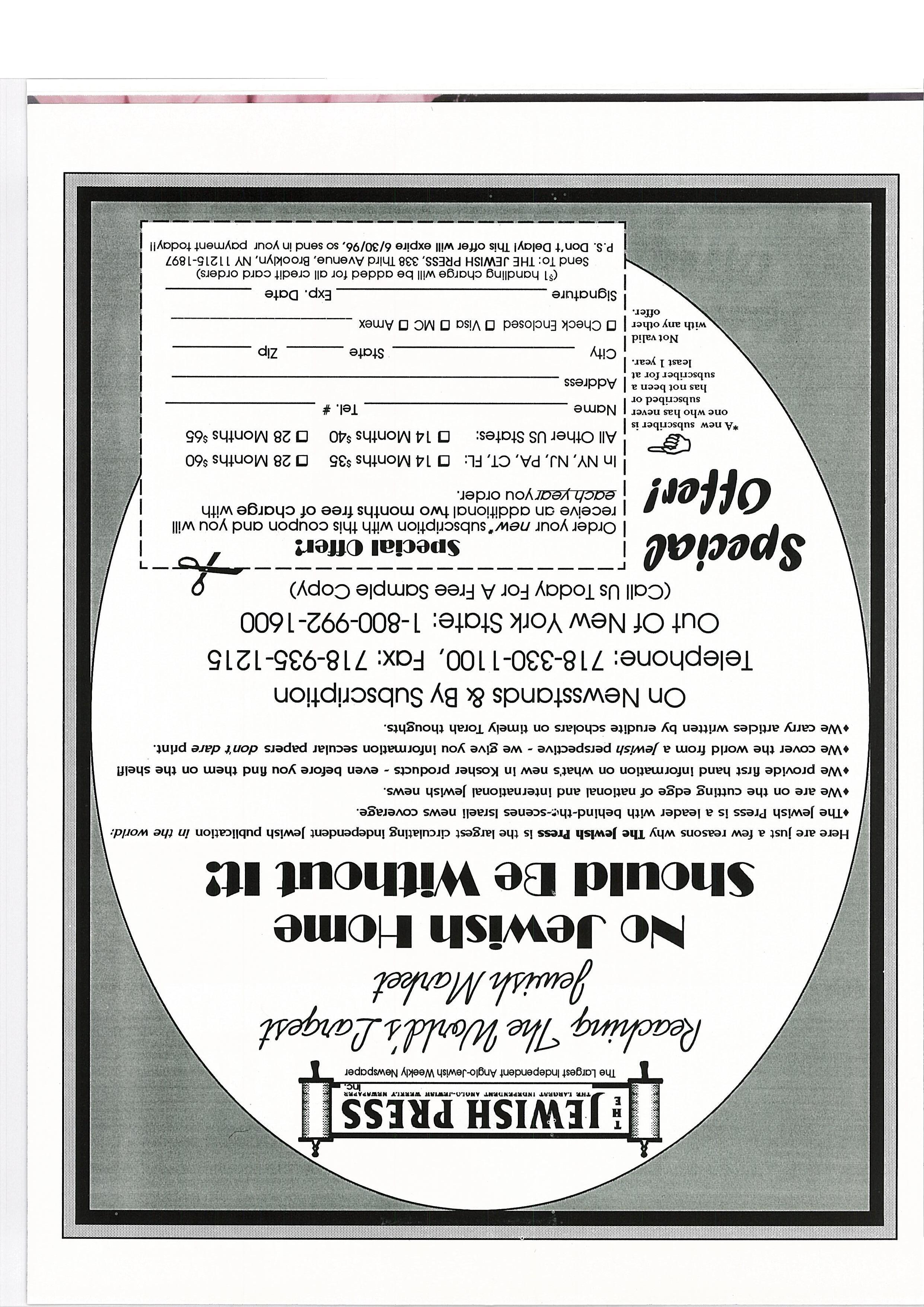 will I receive an additional two months free of charge with I each yearyou order. I In NY, NJ, PA, CT, FL: ~ 14 Months $35 D 28 Months ~6O ç~~’ I All Other US States: IJ 14 Months ~4O EJ 28 Months ~65 ~e%q subscriber is I one who has never Name Tel. # subscnbed or i has not been a Address subscriber for at least 1 year. I City State Zip otvalid I yother I 0 Check Enclosed 0 Visa 0 MC 0 Amex offer. I Signature Exp. Date (9 handling charge will be added for all credit card orders) Send To: THE JEWISH PRESS, 338 Third Avenue, Brooklyn, NY 11215-1897 P.S. Don’t Deloyl This offer will expire 6/30/96. so send in your payment todayII