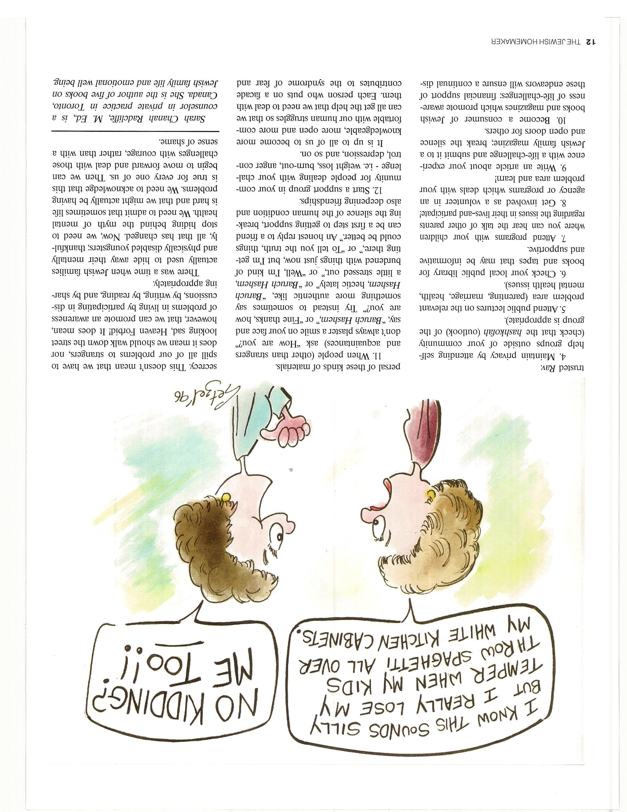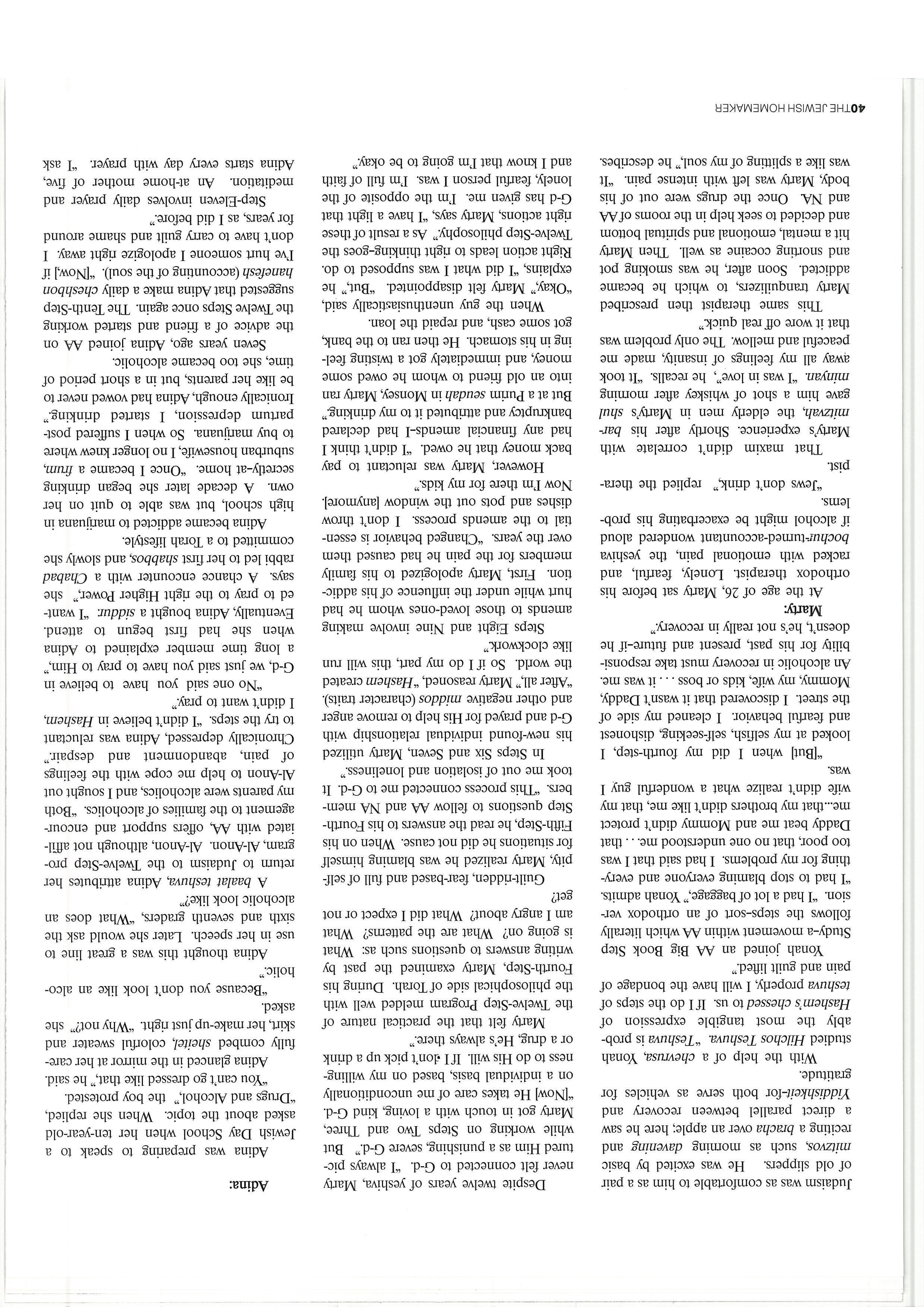 Seven years ago, Adina joined AA on the advice of a friend and started working the Twelve Steps once again. The Tenth-Step suggested thatAdina make a daily cheshbon hanefesh (accounting ofthe soul). “[Now,J if I’ve hurt someone I apologize right away. I don’t have to carry guilt and shame around for years, as I did before.”