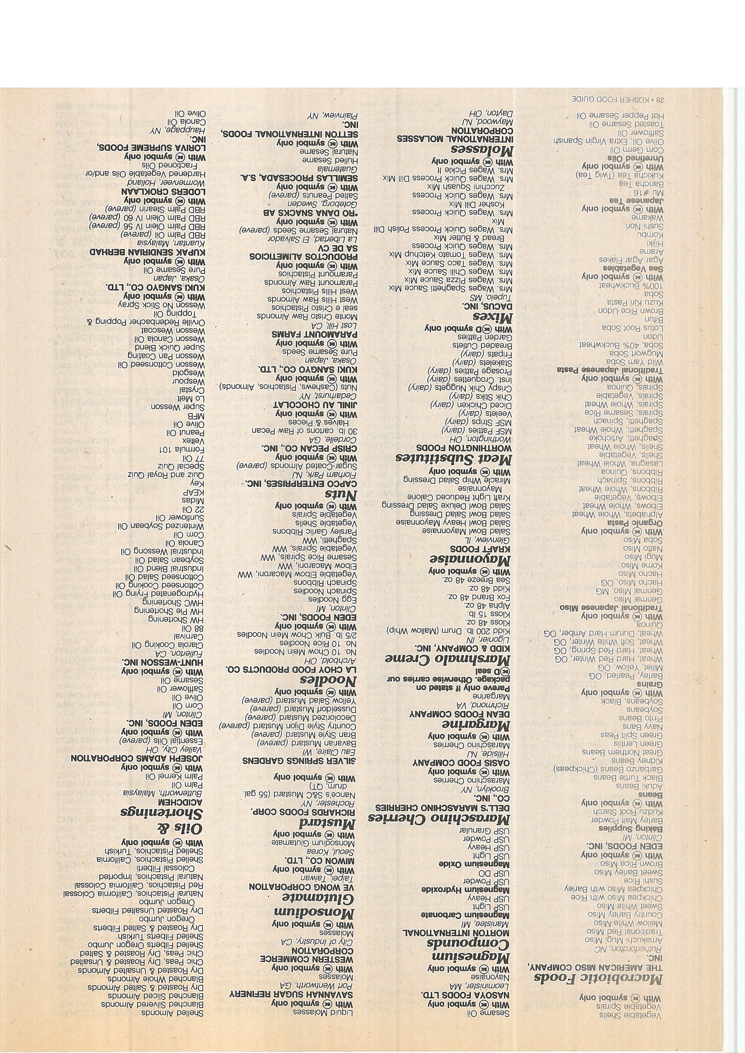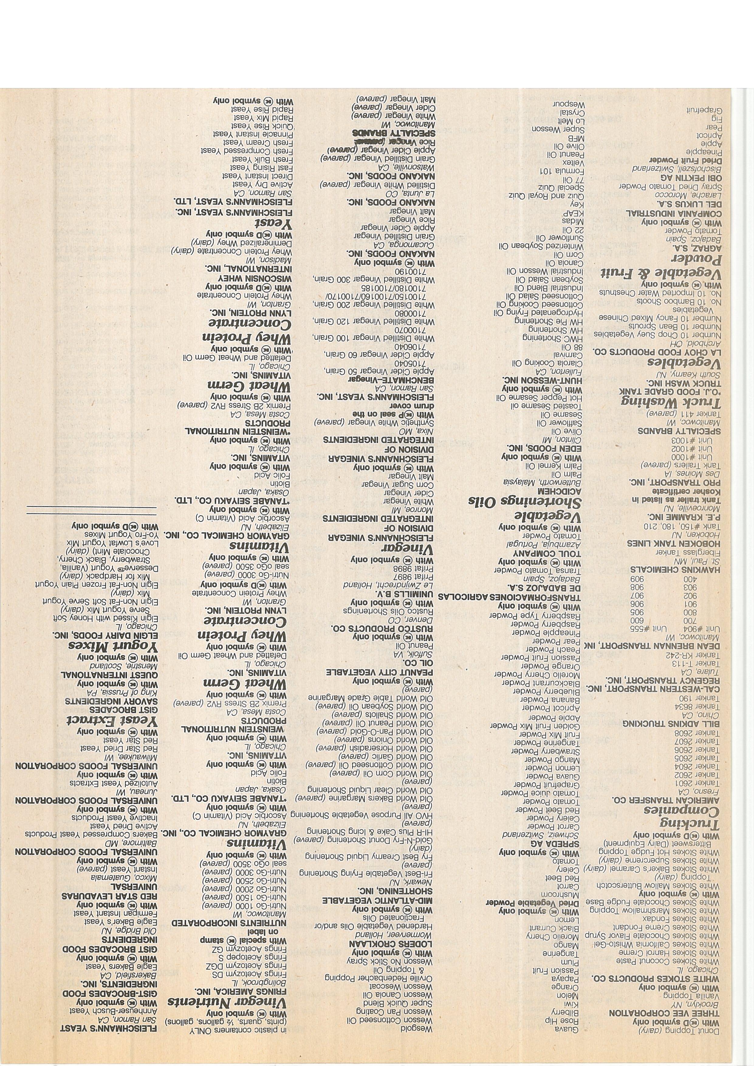 A~le Cider VInegar 50 Grain, Cñicago, IL Vegetables Clarota Cooking Oil 7105040 Defäfieill and Wheat Germ Oil LA CHOY FOOD PRODUCTS CO. Carnival Apple Cider Vinegar 60 Grain, Arclibold, Qt’~ 88 Oil ?~1060~0 With € symt~ol only HWC~Shortening WhitalDistilled Vinegar 100 Grain, Whey Protein Number 10 Chop Suey Vegetables HW Shortening 7100070 Number 10 Bean Sprouts Number 10 Fancy Mixed Chinese 11W Pie Shortening Whita)Di~filled