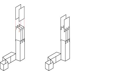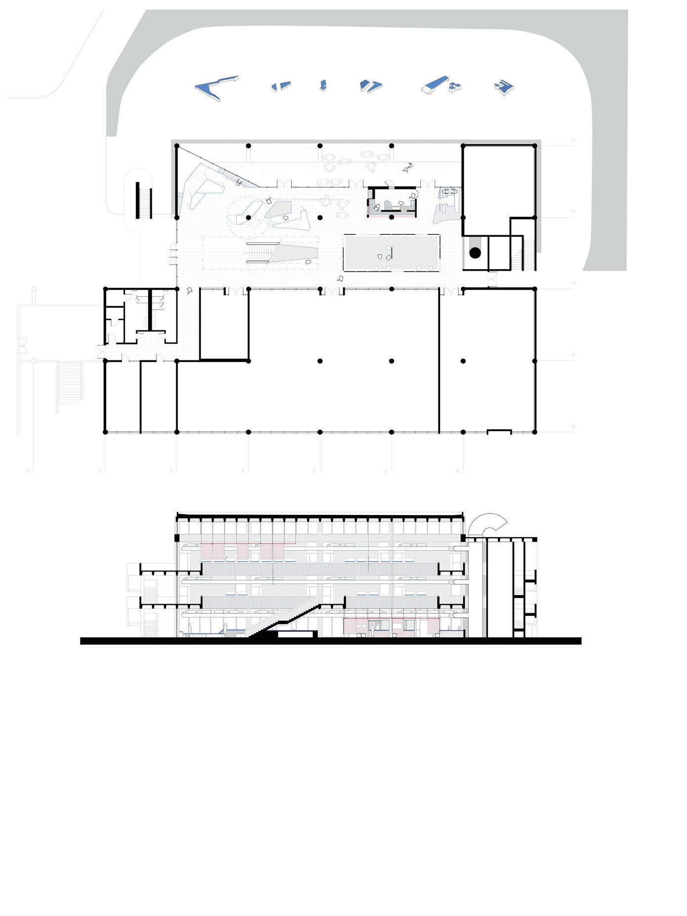 A proposal for the renovation of the Architecture West building on Georgia Institute of Techonolgy's campus. The scheme involves two systems; one that stays on the floor denoted in blue, and a pully system indicated in red. On the first floor, a series of playful shapes provide surfaces for project display, cafe seating, and studying. The pully and cable system sugguests an exciting pin-up experience with display panels inserted into suspended tracks. Additionally, a compact but efficient cafe is capibable of serving students and faculty both inside and outside the building, allowing for the cafe to flexibly operate during the various different events held in the building.
