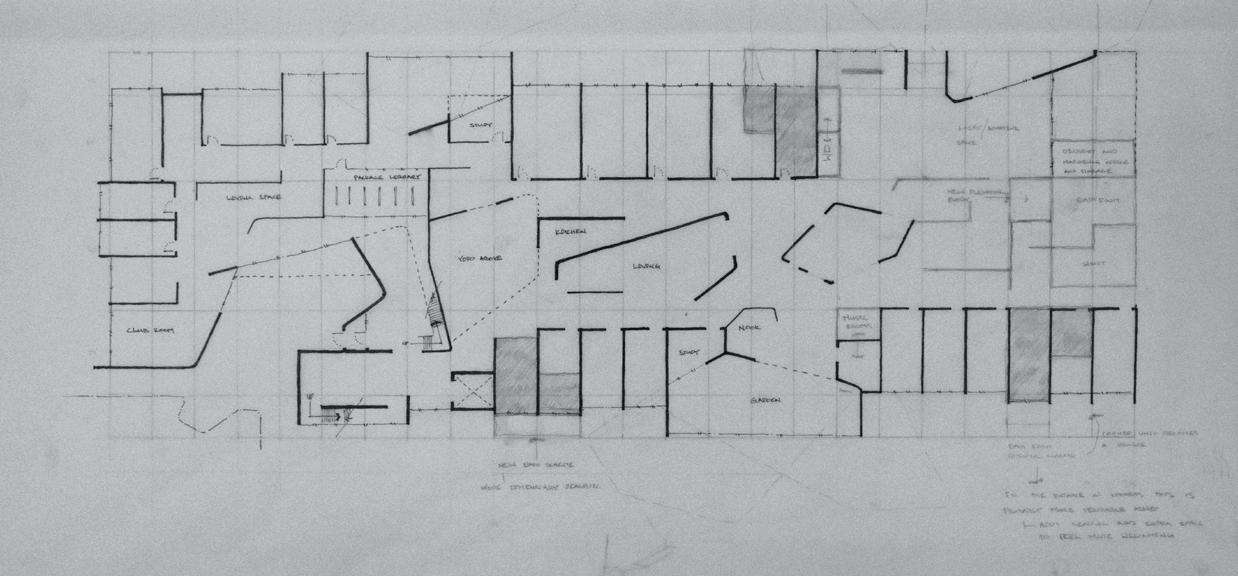 A proposal for a poly-propylene pavillion, constructed only from 25 foot square sheets. The pavillion sits on a junction for foot traffic at the top of a notorious hill outside of The Price-Gilbert Memorial Library. Analysis of the library was done as well, where many hand-drawings were produced. After site analysis was complete, a pavillion was designed in close proximity. Strong horizontal and vertical elements in the pavillion’s architecture refect the surrounding structures and site.