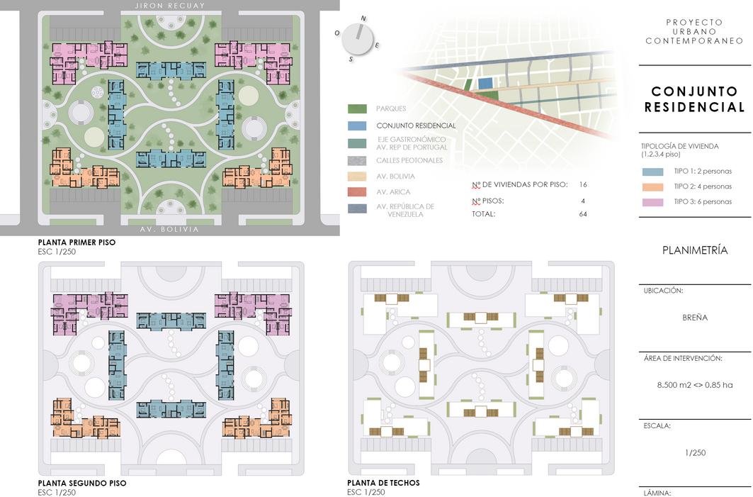 En la propuesta urbana se planteó un mejoramiento de un sector en específico del distrito de Breña, en el cual se tomó en cuenta viviendas en mal estado para un nuevo uso e implementación de áreas verdes, también conjunto residencial para reubicar a las personas.
