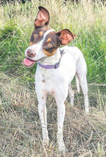 Pflegehund Tayo (l.), ein zweijähriger Podencomix und zurzeit Gast auf Coras Sonnenhof, ist nun bereit für seine eigene Familie. Rechts: Christina Bringmeier mit einigen ihrer vierbeinigen Mitbewohner auf Coras Sonnenhof. Fotos: Coras Sonnenhof