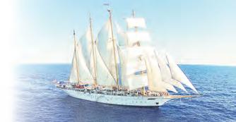 gerichtet. Vom Hafen aus lassen sich die angelaufenen Orte leicht zu Fuß erreichen und so bequem erkunden. Ein absolutes Muss ist ein Bummel durch das malerische Portofino. Man kann sich aber auch auf der Suche nach dem Gendarmen von St. Tropez machen oder auch nur sein Badezeug einpacken, den nächsten Strand ansteuern und sich in den blauen Fluten der Côte d’Azur erfrischen. Zwischen unterhaltend und nervenkitzelnd bewegt sich das angebotene Bordprogramm. Dass die Talente der stets herzlichen Crewmitglieder sich n icht nur auf Cocktails mixen, exzellent kochen oder servieren beschränken, zeigen die Frauen und Männer der „Star Flyer“ in der Crew-Show. Mit Tanz- und Gesangseinlagen unter weißen Segeln und leuchtendem Sternenhimmel begeistern sie ihr Publikum. Aber auch die Kreuzfahrenden selbst können beim Mastklettern an Bord zu Protagonisten werden – vorausgesetzt sie haben keine Höhenangst. Gut gesichert geht es auf einer Strickleiter hoch zu einem Ausguck in – geschätzt – etwa 20 Meter Höhe. Der Mut wird belohnt mit einem Rundumblick auf die „Star Flyer“ und f reie Sicht auf das blaue Meer und die Küste. So viel Mut konnte die bereits erwähnte Stuttgarterin nicht aufbringen. Dieser reichte allerdings dafür aus, dass sie ins g roße Netz am Bug des Schiffes kletterte und für kurze Zeit ihren ganz besonderen „Star Flyer“-Moment genießen durfte – trotz großem Nervenkitzel, aber auch so werden Segelträume wahr.