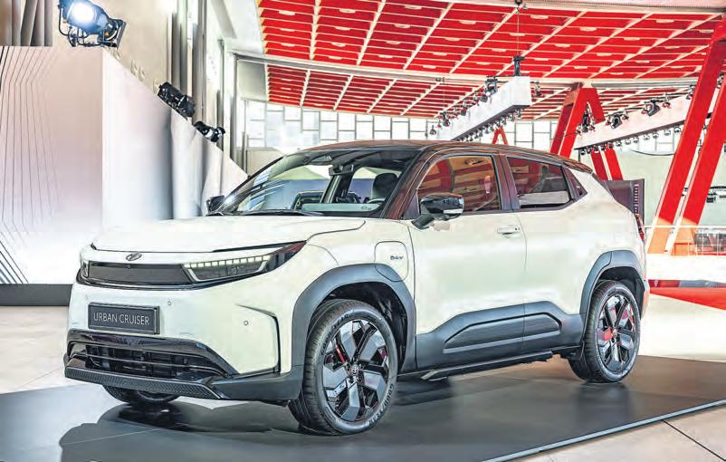 baren Rückbank verfügt er über ein großzügiges Platzangebot. Der Stromer ist serienmäßig mit einem umfangreichen Paket aktiver Sicherheits- und Fahrerassistenzfunktionen ausgestattet, darunter ein Pre-Collision Notbremssystem, eine adaptive Geschwindigkeitsregelanlage, ein Spurverlassenswarner und ein Spurhalteassistent. Zu den Ausstattungsmerkmalen gehören eine 360-Grad-Kamera, ein JBL-Soundsystem und ein elektrisch einstellbarer Fahrersitz. Ein Glasdach wird ebenfalls angeboten. Der Urban Cruiser wird mit zwei Batterieoptionen erhältlich sein: Die 49-kWh-Batterie wird nur mit Frontantrieb und einem 106 kW/144 PS starken Motor angeboten. Die 61-kWh-Batterie ist sowohl mit Front- als auch mit Allradantrieb erhältlich. Die Frontantriebsversion leistet 128 kW/174 PS, beim Allradantrieb liegt die Leistung bei 135 kW/184 PS. Hier kommt ein zusätzlicher 48-kW-Motor an der Hinterachse zum Einsatz.