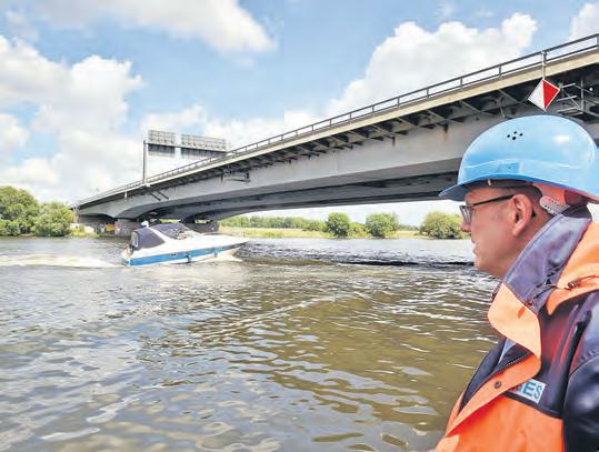 Beulen im Stahl wieder auszugleichen. Etwa 120 Tonnen Stahl und 6.000 Umschweißungen sind dazu nötig. Wir klettern in der Brückenmitte aus dem Kasten und stehen auf einem Steg zwischen den Brückenteilen, durch die Stahlroste sieht man unter uns die Weser. Max deutet auf das gegenüberliegende Brückenteil. „Der mittlere Kasten ist in Ordnung, der wurde ganz anders konstruiert“, erklärt er. 1977 wurden die beiden Teile der ursprünglichen Brücke auseinander geschoben und durch einen dritten ergänzt, um die Brücke zu verbreitern. Seitdem gibt es acht Spuren statt vier. Der Ersatzneubau, der schon jetzt geplant wird, wird voraus-
