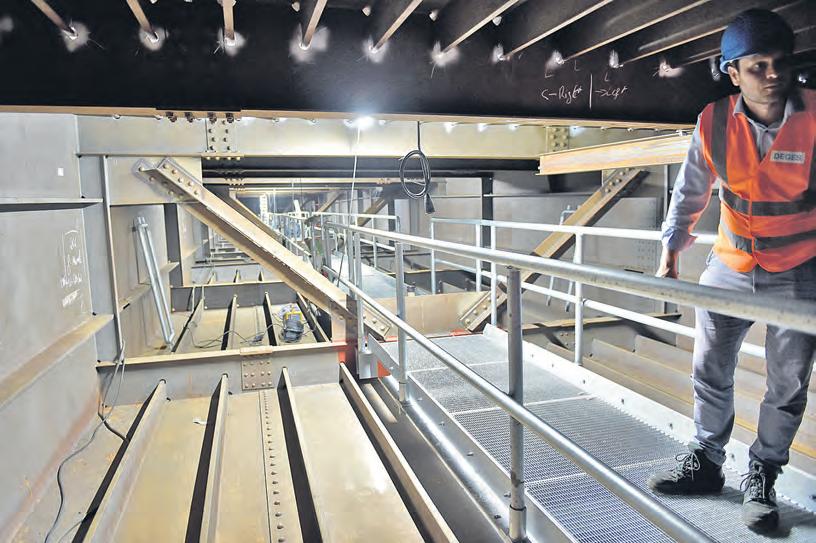 Deges-Projektleiter Sebastian Max übernimmt die Führung. Durch einen schmalen Durchlass klettern wir in den spärlich beleuchteten Metallkasten. „Bis vor ein paar Wochen wurde hier unter Vollschutz gearbeitet“, erläutert Evert. Bevor die Reparaturen beginnen konnten, mussten 24.000 Quadratmeter asbesthaltiger Korrosionsschutz von den Metallteilen entfernt werden.