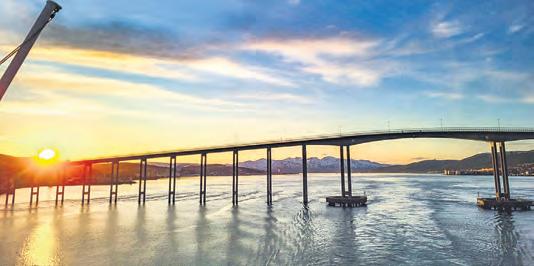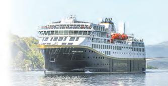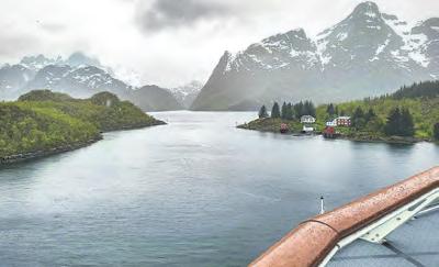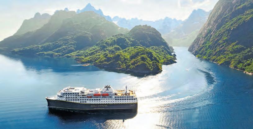 seitigen Natur. Vielmehr verleihen die Wolken, die sich an den Spitzen der zahlreichen Felsen zu verfangen scheinen, der Aussicht etwas Traumhaftes. Fädelt sich das 124 Meter lange und 22 Meter breite Passagierschiff von Havila Voyages durch die schmalste Stelle auf der Route – die spektakuläre Einfahrt in den idyllischen Trollfjord – fühlt es sich beinahe so an, als könne man die Felswände auf beiden Seiten berühren. Verglichen mit den steil aufragenden Bergen wirkt alles ganz klein. Ehrfürchtig versammeln die Gäste sich während dieses Highlights auf den großzügigen Außendecks.