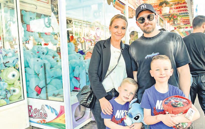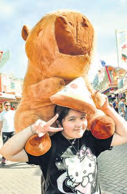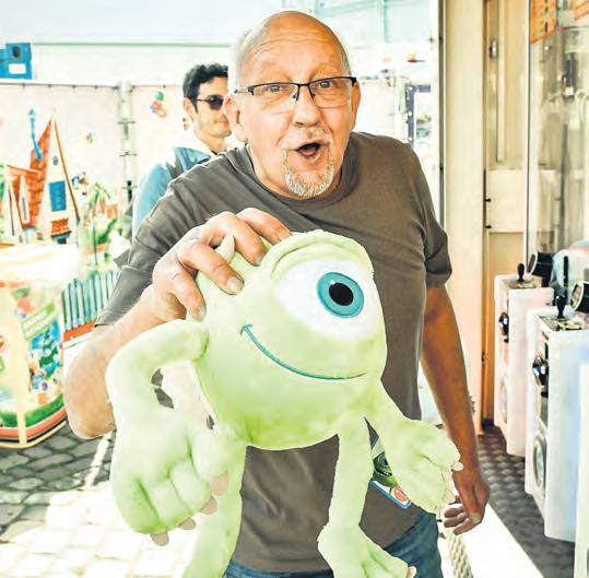 siges Tier auf und ab. Beim Näherkommen entpuppt es sich als überlebensgroßes Capybara – ein Wasserschwein. Das ist wenigstens niedlich, auch wenn es erstaunlicherweise ein Stück Pizza in den Pfoten hält und fast so groß ist wie seine Besitzerin, Almina Imal. Die Zwölfjährige hatte Glück: Mit einem Einsatz von 4 Euro hat sie sich das Plüschteil erspielt, das sie gleich an ihre Mutter weitergibt – zum Tragen. Die ist das schon gewohnt, konnte ihre Tochter doch im vergangenen Jahr bereits einen Hauptpreis absahnen, einen Super Mario Yoshi. „Den haben wir aber verkauft“, sagt Serpil Imal. Verkaufen kommt für Familie Lamping nicht in die Tüte: Die zwei Jungs, ihre Eltern und Opa versuchen gerade, das einäugige Monster Mike Glotzkowski mit einem Greifarm in den Familienbesitz zu überführen. Und dabei läuft Papa Nico schon mit einer Nudelsuppen-Tasche aus Plüsch und Stitch-Figur unter dem Arm herum: „Dafür habe ich nur 14 Euro eingesetzt. Das lohnt sich auf jeden Fall! Alleine der Stitch kostet im Internet locker 22 Euro.“ Inzwischen haben sie schon eine anständig große Kuscheltier-Sammlung zu Hause. Und die wird auch benutzt: „Das ist das Hauptspielzeug der Kinder“, sagt Mama Mila. Dann wird Opa Peter laut: „Ich hab ihn!“, ruft er und reckt Glotzkowski triumphierend in die Luft. Miles und Jack jubeln. Und wieviel Euro hat ihn das gekostet? „24 Euro“, murmelt er. Ob es dabei bleibt? Wohl kaum, denn „wir sind ja gerade erst gekommen...“