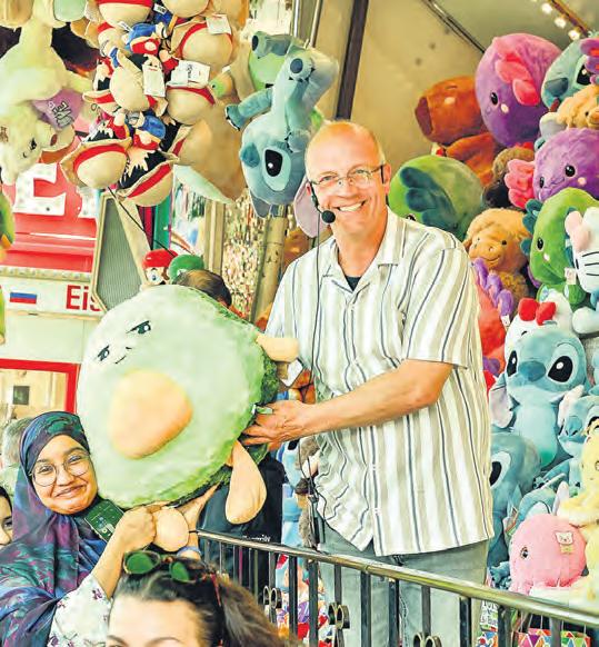 Schausteller Stefan Dormeier übergibt einen der Hauptpreise – eine grinsende Avocado. Fotos: Schlie