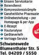 Der heutigen Ausgabe liegen in Voll- oder Teilbelegung folgende Prospekte bei: Action, ALDI Nord, Apetito, Combi, E-Center, EDEKA, Hol Ab, Jawoll, Jysk SE, Lidl, Mitsubishi, netto, NP Discount Schwanewede, Penny, Poco, Roller, Rossmann, Sonderpreis Baumarkt, Thomas Philipps, toom, Das Handwerk, XXXLutz Dodenhof, Zurbrüggen