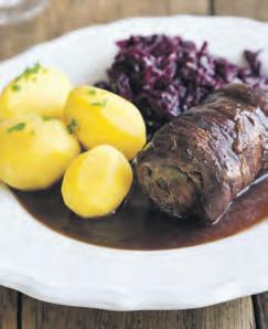 Zarte Rinderroulade “Hausfrauen Art” in einer Burgundersauce, dazu gestovtes Erbsen-Möhren-Gemüse und Petersilienkartoffeln