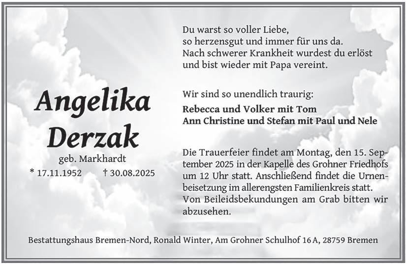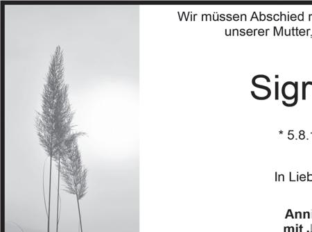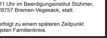Die Beisetzung fand auf Wunsch der Verstorbenen im engsten Familienkreis statt. Ein besonderer Dank an Praxis Zimmermann, Petra Backmann vom Pflegedienst Angelus und den Palliativdienst OPAL für ihre einfühlsame Betreuung sowie dem Bestattungsinstitut Sonnenburg.