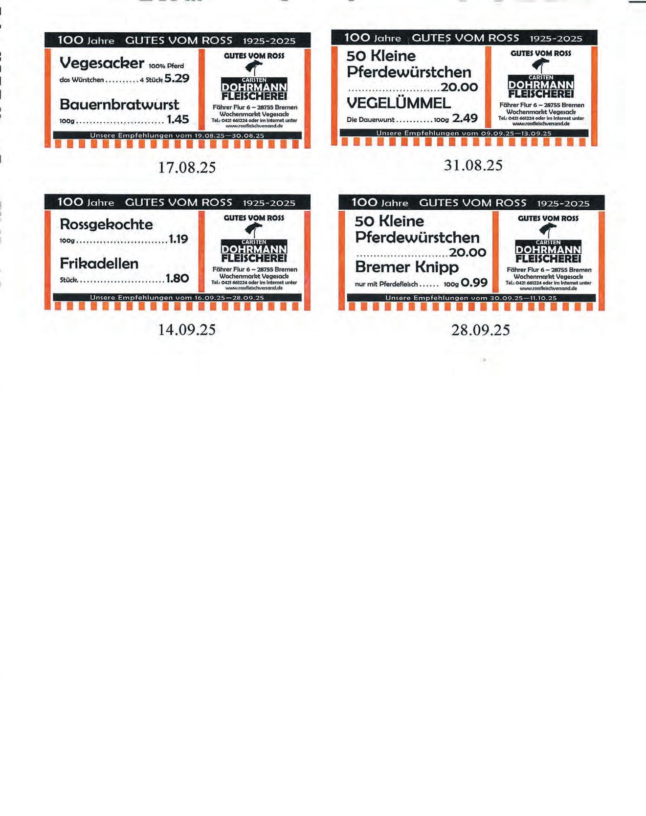 Der heutigen Ausgabe liegen in Voll- oder Teilbelegung folgende Prospekte bei: Action, Aldi, Combi, Dietrich Baustoffe, Douglas, Drogerie Müller, E-Center, Edeka, Das Futterhaus, Gloria, Hagebau, Hol Ab, Jawoll, Jysk SE, Lidl, Mitsubishi, Möbel Boss, netto, NP Discount Schwanewede, Opti Wohnwelt, Penny, Poco, Pro Optik, Roller, Rossmann, Sonderpreis Baumarkt, Thomas Philipps, toom Baumarkt, XXXLutz Dodenhof, Zurbrüggen