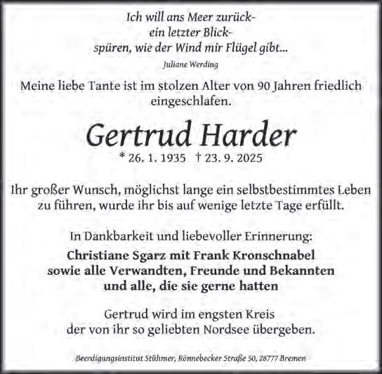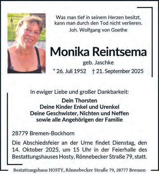 Die Trauerfeier findet am Samstag, dem 11. Oktober 2025, um 10 Uhr im Beerdigungsinstitut Stühmer, Wilmannsberg 2, 28757 Bremen, statt.