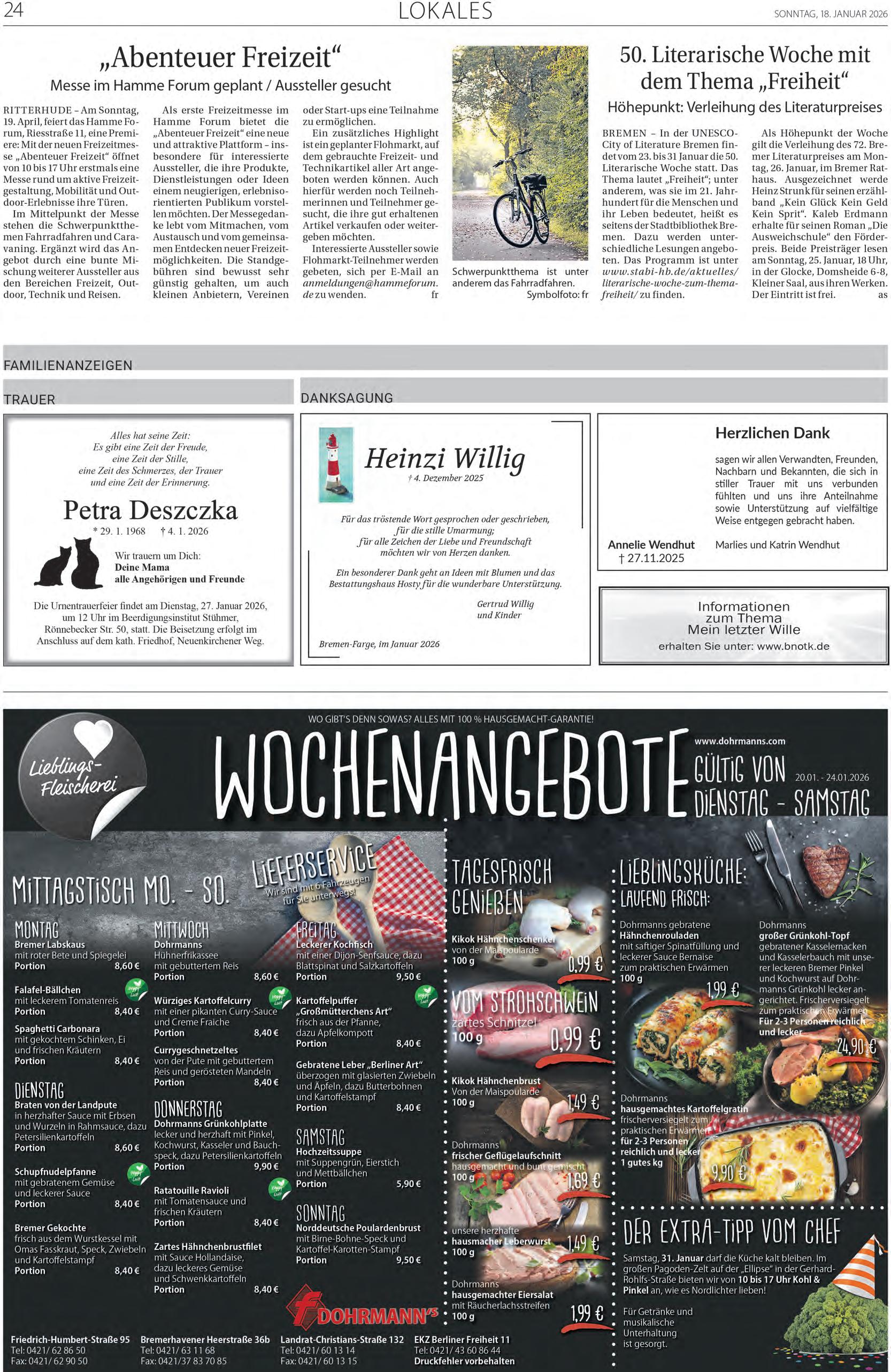 Der heutigen Ausgabe liegen in Voll- oder Teilbelegung folgende Prospekte bei: Aldi, Combi, easy Learning, E-Center, Edeka, Flamme, Jawoll, Jysk SE, Lidl, Möbel Boss, Nah u. Gut Schwanewede, netto, Penny, Poco, Sonderpreis Baumarkt, Thomas Philipps, toom, XXXLutz Dodenhof, Zurbrüggen