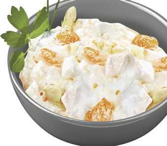 Geflügelsalat feines Hühnerfleisch mit Sellerie, Spargel, Ananas und Mandarinen in einer aromatischen Salatcreme 100 g (1 kg = 14.90)