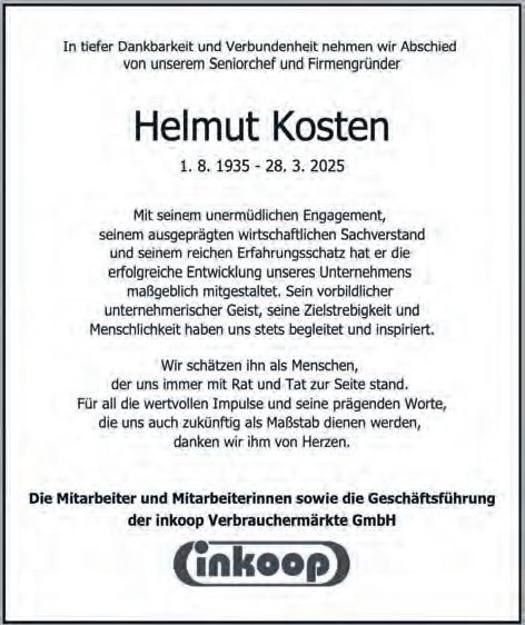 griff für „Einkauf“ wünschte. Helmut Kosten bewies genau den richtigen Riecher für die Entwicklung im Handel mit Lebensmitteln und Waren aller Art. „Handel ist Wandel, Stillstand ist Rückgang“, betonte er zum 50-jährigen Firmenjubiläum. Heute gibt es insgesamt neun Inkoop-Märkte in Delmenhorst, Ganderkesee, Bookholzberg, Harpstedt, Brinkum und Bassum. Außerdem betreibt das Unternehmen zwei Koopje-Märkte in Delmenhorst und BremenHabenhausen. Helmut Kosten sah die Verbrauchermärkte nicht nur als Orte zum Einkauf, sondern auch als soziale Treffpunkte. Schließlich bestehe der überwiegende Teil der Inkoop-Kundschaft aus treuen Stammkunden, und die Märkte sollten die ersten Ansprechpartner in der Nachbarschaft sein.