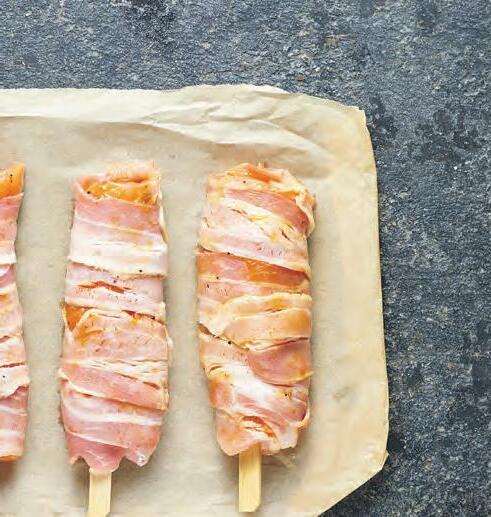 Lachsfackel Bacon praktisch grätenfreie, saftige Lachsfiletstücke ohne Haut, mit Speck umwickelt und würzig mariniert 1kg = 2,49 100g