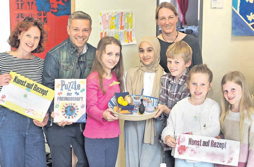 „Kunst auf Rezept“ 2025 laden Kunstschulen anlässlich der landesweiten Aktion „Kunst auf Rezept“ Abgeordnete des Niedersächsischen Landtages zu einer Sprechstunde in die „KunstschulPRAXIS“ ein. Auf der Basis eines Anamnesebogens kommen Kinder und Jugendliche mit Politikerinnen und Politikern ins Gespräch. Anschließend entwerfen und gestalten die jungen Menschen f ür die persönlichen Anliegen der Abgeordneten individuelle Behandlungen. Die Therapien sind so vielfältig wie die Kunstschulpraxis. Denkbar sind Sehhilfen, Wunderpillen, virale Spiele, visualisierte Nebenwirkungen oder Werkzeuge zur Linderung der Beschwerde. Nachdem der SPD-Landtagsabgeordnete Deniz Kurku der Jugendkunstschule Delmenhorst M itte März einen Besuch abgestattet hatte, bekam er nun die „Medikation“ verabreicht. Unter der Leitung der Kunstgrafikerin Julia Vogel konnten die Kunstschü ler in der Sprechstunde den Patienten untersuchen, danach sein A nliegen diagnostizieren und eine Behandlung entwerfen.