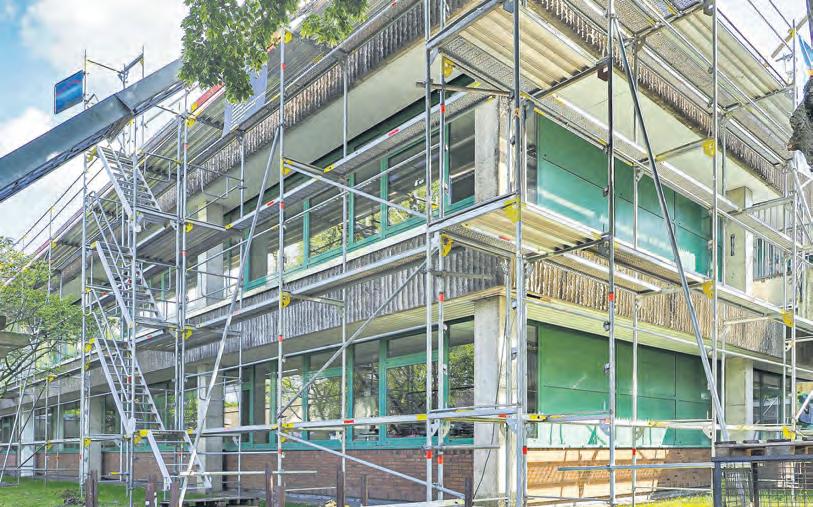 Das Hauptgebäude bekommt zudem ein neues Leitungsnetz für Trink- und Abwasser, wobei im Zuge dessen auch die Haupt-WCs gleich mit saniert werden. Darüber hinaus wird das Treppenhaus 3 für den Brandschutz mit einer Rauchund Wärmeabzugsanlage nachgerüstet und eine Wärmepumpe mit Brennwertgerät wird installiert. „Die ist ausfallsicherer“, erklärt Krauß. Somit ist das Gebäude für die nächsten Jahrzehnte gut gerüstet. Die unterrichtsfreie Zeit in den