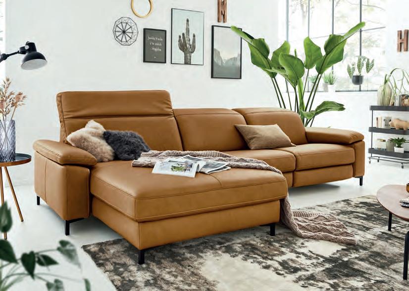 Bezug Leder Longlife Vivre kurkuma, Metallfuß schwarz, best. aus: 3-Sitzer mit Armlehne rechts und XL-Canapé mit Armlehne links, Rücken Spannstoff, inklusive manueller Kopfteilverstellung an allen Elementen. Stellmaß ca. 347x176 cm. Ohne Zierkissen und Decke.