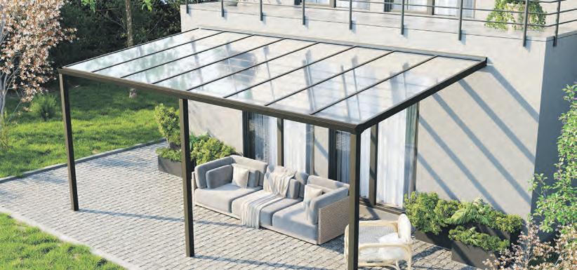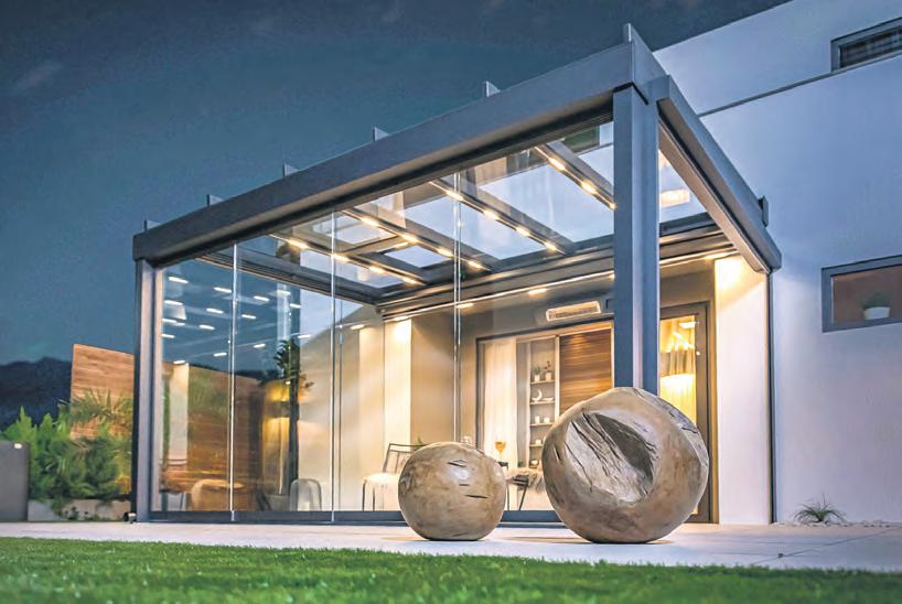 Stolperfallen bilden. Durch ihre äußerst schlanke Ausführung benötigen sie nur sehr wenig Platz. Im Sommer können die Glaselemente einfach zu Seite geschoben werden und eine offene Terrassenfläche mit freiem Übergang in den Garten entsteht. Während der Übergangszeiten zeigt sich das Glashaus dann von seiner stärksten Seite: Mit Hilfe des Wetterschutzes wird die Freiluftsaison erheb-