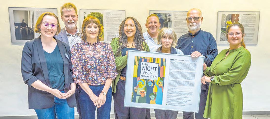 Die Ausstellung „Es ist nicht leise in meinem Kopf“ hat unter dem Engagement von Oliver Hoyer (5. v. l.) in der VHS ein Zuhause gefunden. Foto: Martina I. Meyer