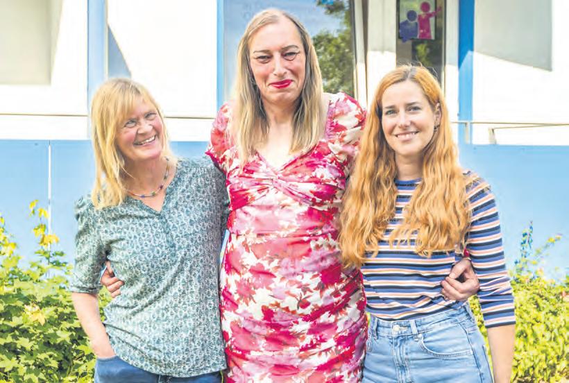 Tanja Henning (Mitte) sowie Bea Brüsehoff (l.) und Sarah Stellamanns vom Nachbarschaftsbüro Düsternort freuen sich, dass „Pink Trans*“ sich wieder vor Ort trifft. Foto: Martina I. Meyer