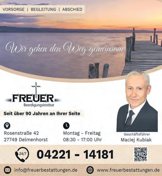 Anzeigenleitung: Sandra Pelka-von Lehmden 91 70-11 Zurzeit gelten Anzeigenpreisliste Nr. 52 vom 01. Januar 2025 und unsere darin abgedruckten AGB. Falls Sie dieses Produkt nicht mehr erhalten möchten, bitten wir Sie, einen Werbeverbotsaufkleber mit dem Zusatzhinweis „Keine kostenlosen Zeitungen“ an Ihrem Briefkasten anzubringen. Weitere Informationen finden Sie auf dem Verbraucherportal www.werbung-im-briefkasten.de Internet: www.delmereport.de