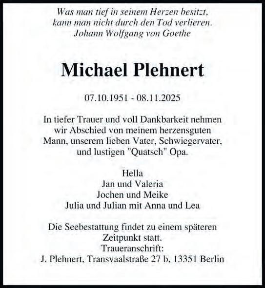 Die Trauerandacht findet am Dienstag, dem 9. Dezember 2025, um 11.30 Uhr im Andachtssaal, Welsestraße 49, statt.