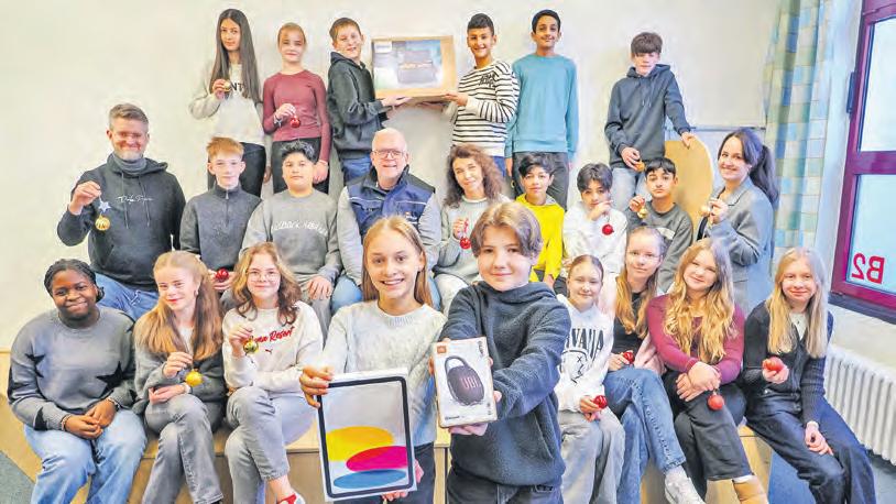 Ein iPad, eine Heißluftfritteuse und ein Bluetooth-Lautsprecher zählen zu den Top-Preisen, die es bei „Weihnachten am Willms“ zu gewinnen gibt. Die Klasse 7a freut sich mit dem stellvertretenden Schulleiter Klaas Wiggers (zweite Reihe li.), Michael Havekost und Evgenia Himmelspach von Mausolf (zweite Reihe, Mitte) und Klassenlehrerin Malin Belizaire (re.) auf das Event. Foto: Konczak