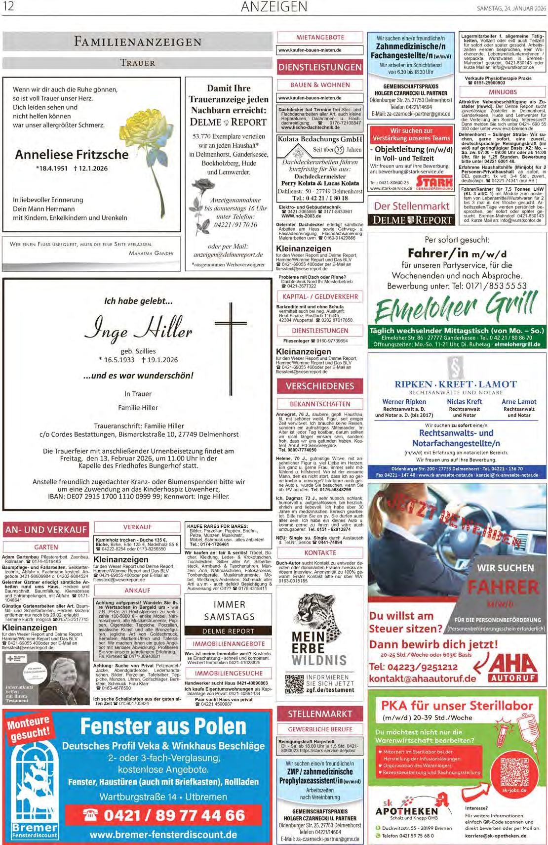 Zurzeit gelten Anzeigenpreisliste Nr. 53 vom 01. Januar 2026 und unsere darin abgedruckten AGB. Falls Sie dieses Produkt nicht mehr erhalten möchten, bitten wir Sie, einen Werbeverbotsaufkleber mit dem Zusatzhinweis „Keine kostenlosen Zeitungen“ an Ihrem Briefkasten anzubringen. Weitere Informationen finden Sie auf dem Verbraucherportal www.werbung-im-briefkasten.de Internet: www.delmereport.de