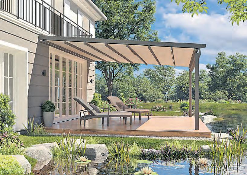 terbedingungen konzipiert. Dank ihrer regenfesten Stoffe können Pergolamarkisen auch bei Regen offen bleiben. Manche Modelle sind sogar optional mit absenkbaren Säulen am vorderen Tuchende ausgestattet, um Regenwasser ohne Stau direkt ablaufen zu lassen. Noch besseren Regenschutz bieten sogenannte Wetterschutz-Pergolen. Sie besitzen ein komplett wasserdicht beschichtetes Gewebe, das beim Einfahren nicht eingerollt, sondern segmentweise zusammengeführt wird. Das ist nicht nur praktisch, sondern verleiht der Terrasse zudem mehr Exklusivität und Eleganz. Mit intelligenter Steuerungstechnik lässt sich die Bespannung jeweils per Tastendruck oder App an die Witterung anpassen. Empfehlenswert sind