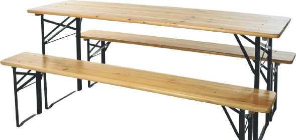 Bierzeltgarnitur** zwei Bierbänke mit Tisch, 100 % FSC-Holz, Füße aus Metall mit schwarzer Lackierung, Maße Tisch: ca. 180 x 50 x 76 cm, Maße Bank: ca. 180 x 25 x 46 cm 79.99 Aktion