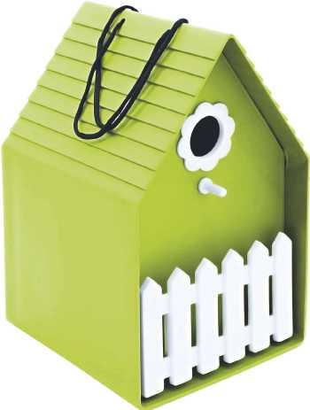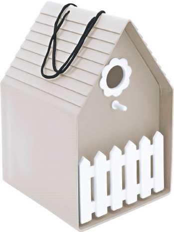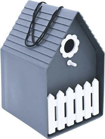 Nistkasten mit Gartenzaun aus Kunststoff, zum Hängen. Die integrierte Sitzstange erleichtert den Einstieg in den Nistkasten