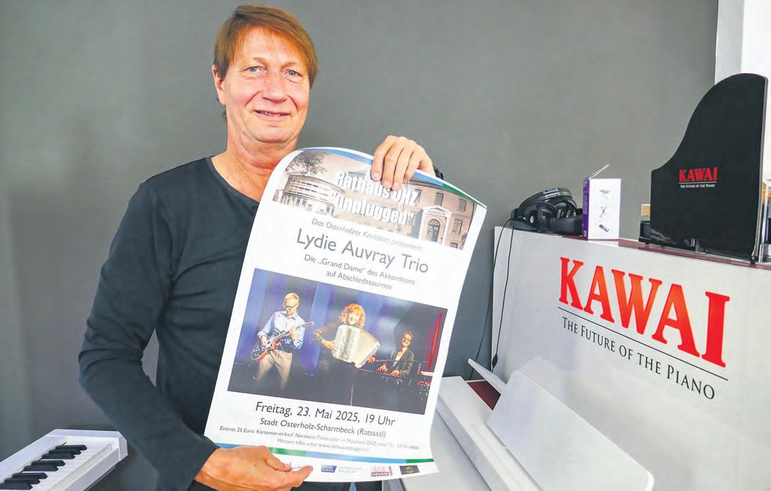 - In diesem Frühjahr startete die „Grand Dame“ des Akkordeons, Lydie Auvray mit Trio, ihre Tournee „Salut! Et merci“. Nach fast fünf Jahrzehnten wird es ihre Abschiedstour sein. Dem Veranstaltungsteam Rathaus OHZ–unplugged mit Detlef Gödicke gelang es, das Trio nach Osterholz-Scharmbeck zu ordern. Der Ratssaal, in dem sonst heftig diskutiert wird, verwandelt sich am Freitag, 23. Mai, 19 Uhr in einen glamourösen Konzertsaal.