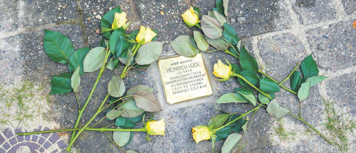 Mitglieder der Stolperstein-Initiative Landkreis Osterholz legten Rosen am Gedenkstein mit Messingplakette ab. Der Stolperstein zum Gedenken an Heinrich Kück befindet sich an der Karlstraße 31.