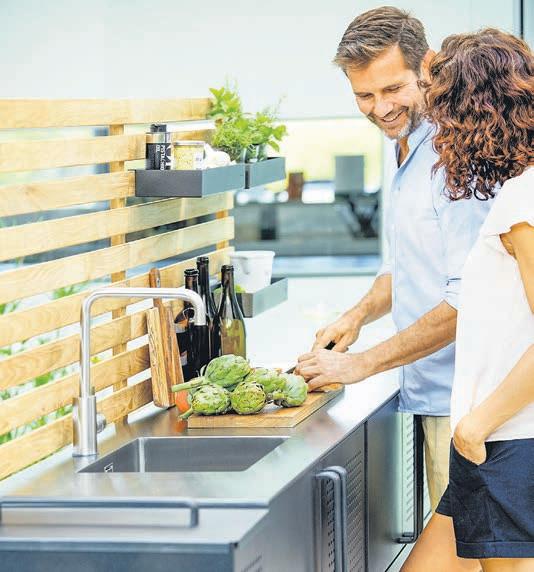 en wie wiederauf bereitetes Altholz aus Eiche oder Buche“, empfiehlt Holm Breit kopf von der BHW Bau sparkas se. „Sie sind ei ne gute, weil nach haltige Alter native.“ Der Fach handel hat den Markt entdeckt. Outdoorküchen sind als professionell designte Küchen zeilen mit ausgeklügeltem Modulsystem erhält lich. Aber was tun, wenn in der kalten Jah reszeit auch die teure Gar ten-Küche kalt bleiben muss? Kein Problem: OutdoorHerde kann man im Winter in den Kel ler oder Gar ten schuppen rol len. Dort war ten sie gut geschützt, bis sie zur nächsten Koch sai son wieder angeheizt werden kön nen.