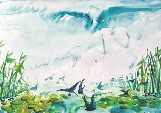 Hans Jürgen Wormeck ist ein vielseitiger Künstler. „Flugtiere auf der Liebe, Prabuty“ von 2005 ist eine in Polen entstandene Aquarellmalerei. Dem Künstler zufolge ging es darum, die Stimmung eines nebelverhangenen Tages einzufangen. Bild: Wormeck