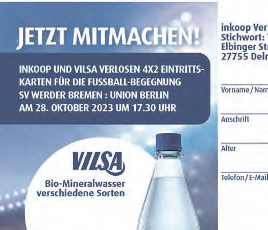 Teilnahmebedingungen: Mitarbeiter der Firma VILSABRUNNEN Otto Rodekohr GmbH sowie deren Angehörige und Mitarbeiter der Inkoop Verbrauchermärkte GmbH und dazugehörige Unternehmen sind nicht Teilnahmeberechtigt. Zu gewinnen gibt es 4x2 Eintrittskarten für die Fuss-ball-Begegnung SV Werder Bremen gegen Union Berlin (28. Oktober 2023/17:30 Uhr). Teilnahmeberechtigt sind alle Personen ab 18 Jahren. Der Gewinner wird telefonisch benachrichtigt. Eine Barauszahlung oder ein Umtausch des Gewinnes ist nicht möglich. Der Rechtsweg ist ausgeschlos-sen. Datenschutz: Um Sie als Gewinner eindeutig identifi zieren und Missbrauch vorbeugen zu können, benötigen wir von Ihnen Namen und Adres-se (persönliche Daten). Die Teilnahmeunterlagen werden nach Ende der Aktion vernichtet. Die persönlichen Daten werden weder gespeichert, verarbeitet noch für Werbe- und Marktforschungszwecke verwendet. Eine Weitergabe an Dritte findet nicht statt. Die Teilnahme am Gewinnspiel ist unabhängig vom Kauf der Produkte. Mit der Abgabe der Gewinnspielkarte erklären Sie sich automatisch mit den Teilnahmebedingungen einverstanden. Einsende-/Abgabeschluss ist der 15.10.2023
