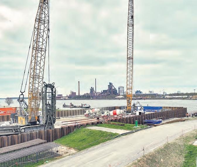 Eine Spundwand, die bis in den Fluss reicht, lässt erahnen, wo der Tunnel später vom Land in den Wesersand wechseln wird. Die Tunnelausfahrt wird allerdings ein ganzes Stück weiter an Land liegen. Schließlich muss die Röhre tief genug im Wesergrund liegen, damit die Wasserstraße nicht beeinträchtigt wird. 23 Meter unter dem mittleren Wasserstand werde die Sohle der Unterwas-